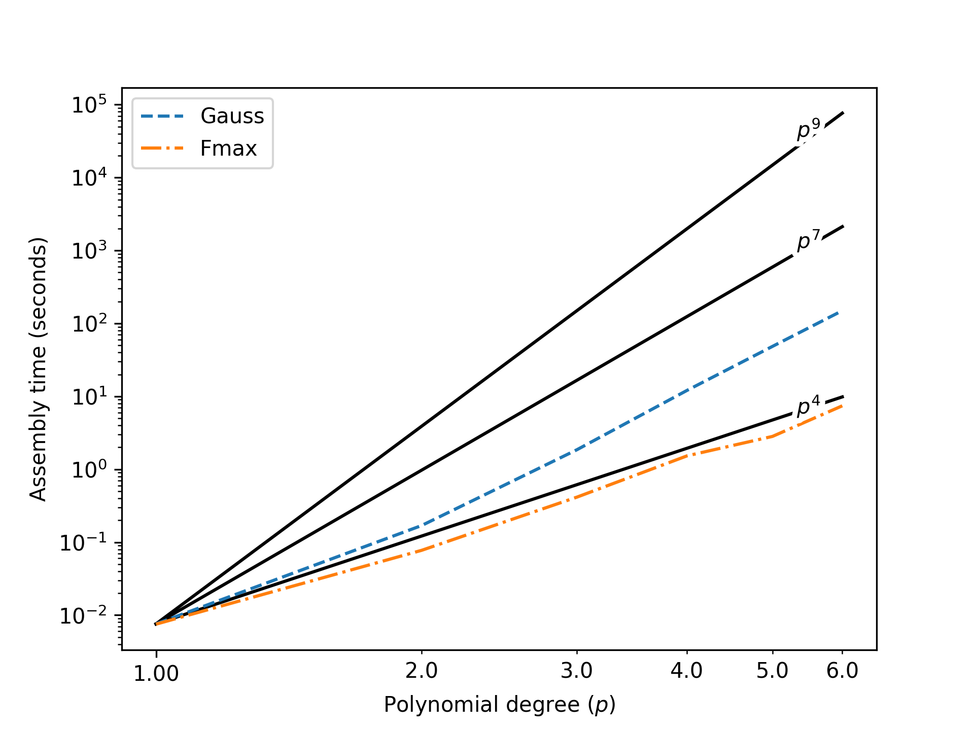 The sum factorization procedure is used for spectral elements and other higher order methods. Hiemstra et al. [42] presented results demonstrating significant improvement in formation and assembly times for single patches. These results have been reproduced in the Coreform codebase. Figure 131 shows the time spent on assembly of the mass matrix for a block as a function of the polynomial degree used to build the spline basis of maximal continuity over the block. Lines are also drawn to show the theoretically significant rates of , , and . Element-based assembly is expected to be proportional to , Gauss-based sum-factorized row assembly should be proportional to , and the reduced quadrature should be proportional to . Although we do not have benchmarked element-based assembly results here, we have included the curve for reference. The sum-factorized assembly based on a Gauss rule follows the expected rate. The sum-factorized assembly based on a quadrature rule derived from function maxima that results in ( is the parametric dimension) points per elements also exhibits the expected rate. As the polynomial degree increases, the assembly times become prohibitive. The reduced quadrature rule results in assembly times that are between one and two orders of magnitude less than the Gauss-based sum-factorized assembly which in turn is several orders of magnitude faster than the projected times for element based assembly.