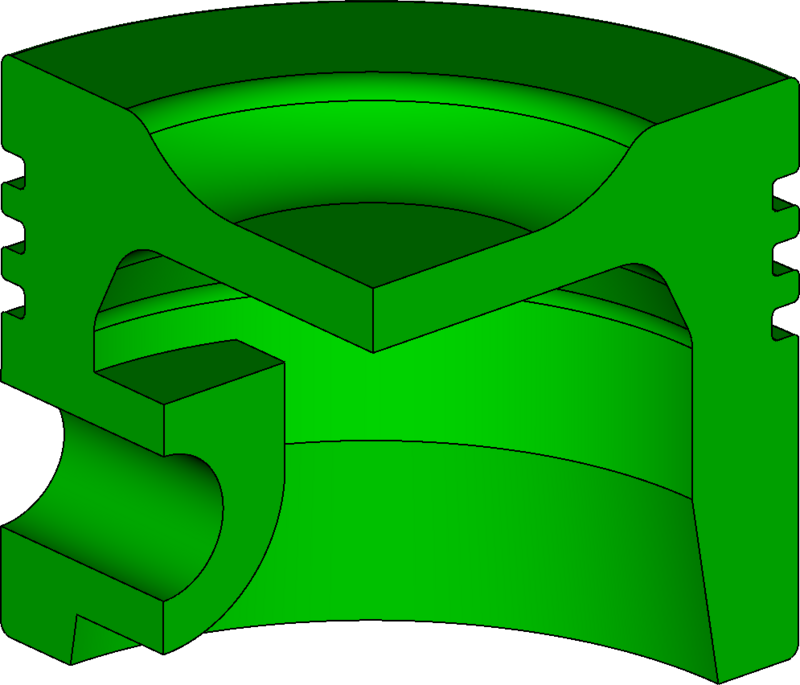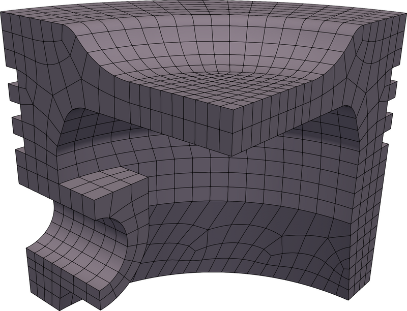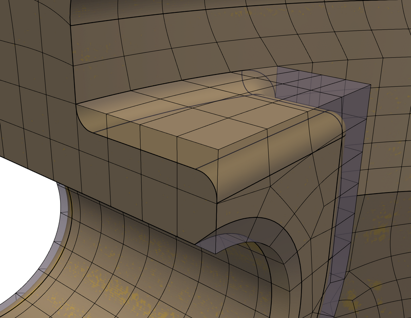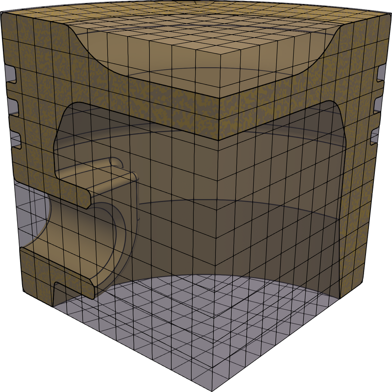 The U-spline associated with each flex model are shown in figures 135a, 135b, 135c, 135d, and 135e. We again note that both and have U-splines that are equivalent to their respective physical domains, while have at least part of the physical domain immersed within the U-spline. As expected, has the highest element count of the alternatives shown, due to the requirement that the mesh both fit all small features in the CAD model and be a conforming hexahedral mesh. A closeup of a partially-immersed CAD feature is shown in figure 136.