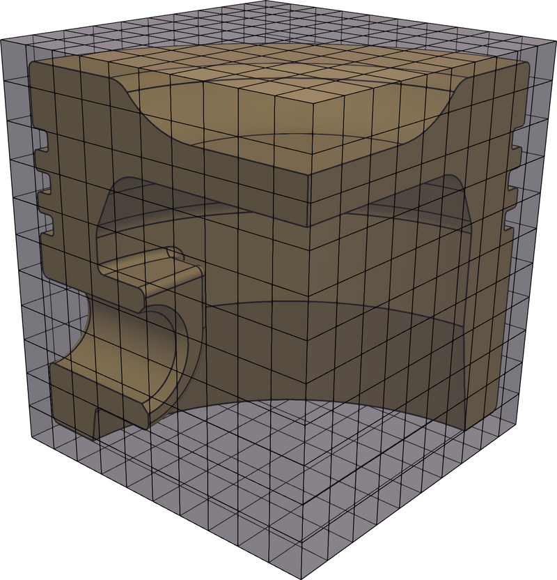 : In , all features of the CAD geometry, shown in figures 132e, 133e, and 134e, are immersed within the rectilinear U-spline, shown in figure 133e. As shown in figure 134e, this rectilinear U-spline is trivial to mesh. In this case, the analyst has in fact eliminated all manual labor associated with mesh generation. While all the previous approaches can utilize adaptivity to boost accuracy, will in most cases require local adaptivity to produce the best results.